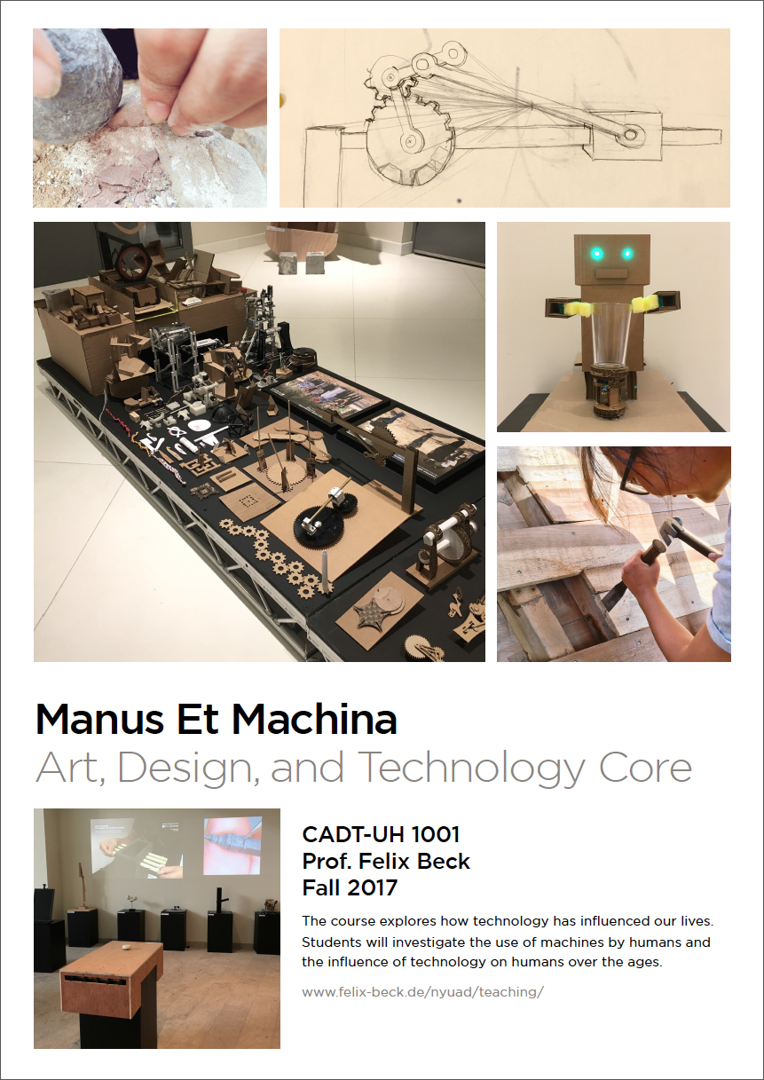 The course »Manus Et Machina« is a Core Competency Course in the field of Art, Design, and Technology. It is cross-listed with the Design Minor. This course teaches students to think critically and work creatively toward innovations in arts practice, design and engineering, creative writing, data visualisation, programming, and performance. Guest lecturers as much as interdisciplinary co-teaching plays an important role in this course.