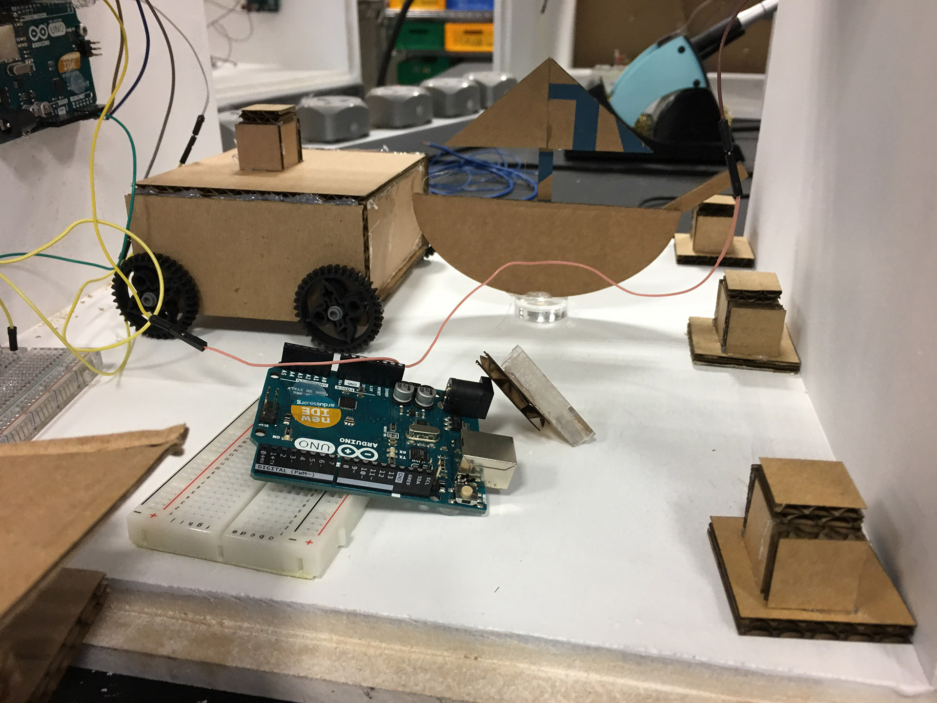 Task for 2017: Every participating student will have to create a machine that fits into a white box, that will be handed out to each student (see above). The boxes will be inter connected with a signal cable. A signal will be handed over from one machine to the next (from one students' work to the next). The moment a signals occurs in ones box the student has 30 seconds of time to start and run their individual machines. Find the different code versions for the Arduino Uno Boards that are used in the Boxes here. Example ideas: m_m2017_ideas.png