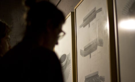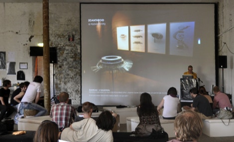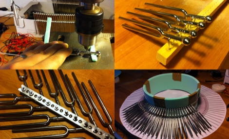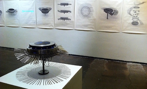 A main characteristic of the anatomy of Hexacorallia Zoantharia is a ring of bifurcated cilia which both senses and provides motile function. In the Zoanthroid, these functions of the cilia are elaborated analogically, deploying ninety tuning forks, which resemble the bifurcated structure of the Zoantharian cilia. The tuning forks are actuated mechanically in rhythmic undulating movements. They are also actuated acoustically by transducers in the body of the Zonathroid, which causes them to ring sympathetically. The sensing capability of the cilia is implemented technologically by deploying the cilia as theremin-like conductive antennae. This permits range-finding of human bodies within a short distance from the device. In exhibition, Zoanthroid is accompanied with a set of elegant technical drawings (see below) which emulate both engineering mechanical drawings, and biological anatomical studies.