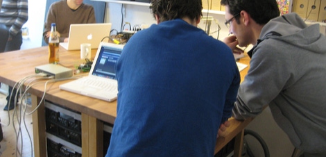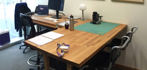 ccuadraTisch is a quadratic table that can be pulled apart and can be rearranged in several variations. The square version gives enough space for up to 12 people work standing or sitting on bar stools e.g during workshop sessions. The area below offers enough free space to store boxes for your tools or other stuff.