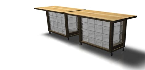 An open-source wooden quadratic table that can be pulled apart to be rearranged in several variations.