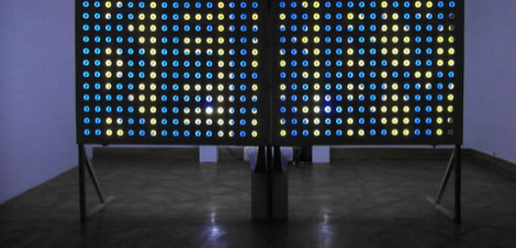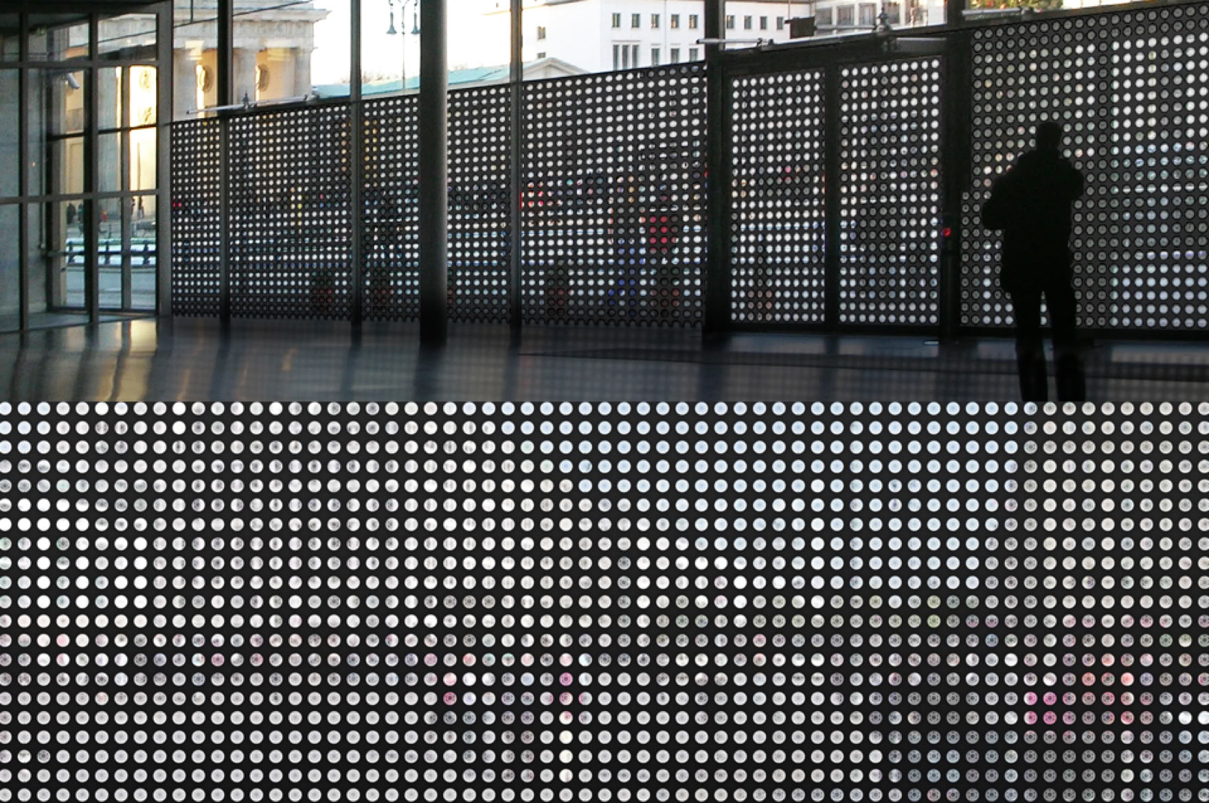 A large scale array of speakers that transforms visuals into auditory images. The soundscape and the visual reference are directly superimposed on each other by using transparent speakers. Image content projected onto the back side of the Soxels wall, either by using video projectors, or natural light sources such as shadows of people walking by, generate the visuals that are on the very same place transformed into an acoustic collage assembled out of hundreds or thousands of individual sound sources. The speakers function as light waves into sound waves transformers. Thus each speaker becomes equally a visual and a sound pixel. This visual to sound transformation is performed by sophisticated sound processing technology that provides each speaker with an individual sound stream relating to the respective local picture content.