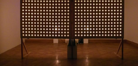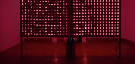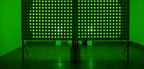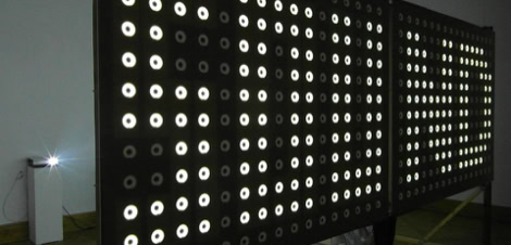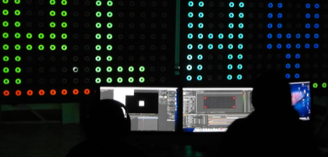 A back-projected translucent speaker array functions as a membrane transforming lightwaves into soundwaves.