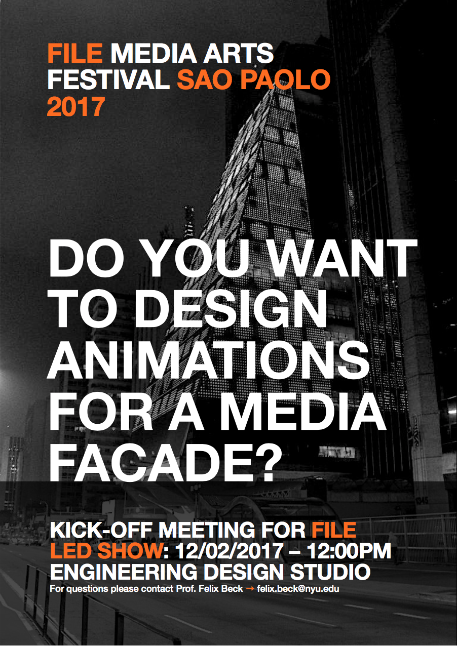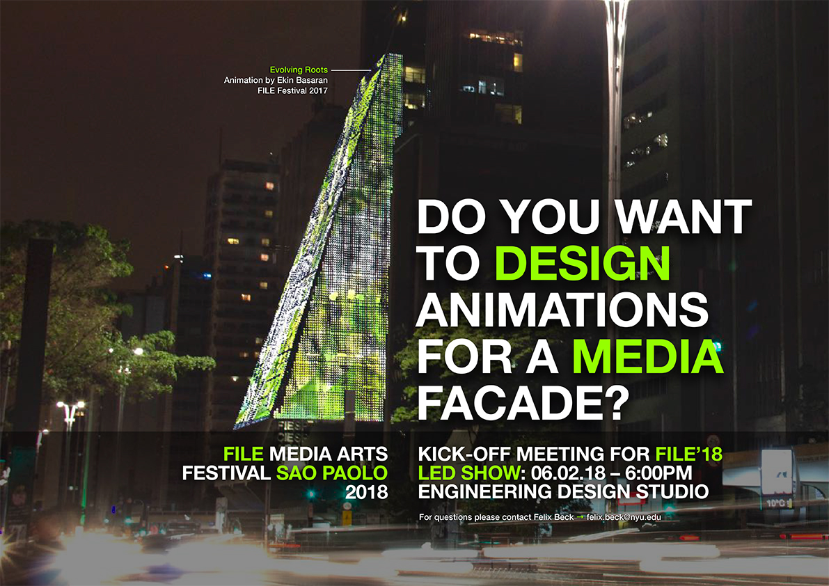 Several groups of NYUAD students, staff and faculty already attended in 2017 and 2018 at the FILE Media Arts Festival in Sao Paulo Brazil. Find below information on the 2019 round for the LED PROJECT project: Designing Animations for a Media Facade for FILE Media Arts Festival Sāo Paulo.
