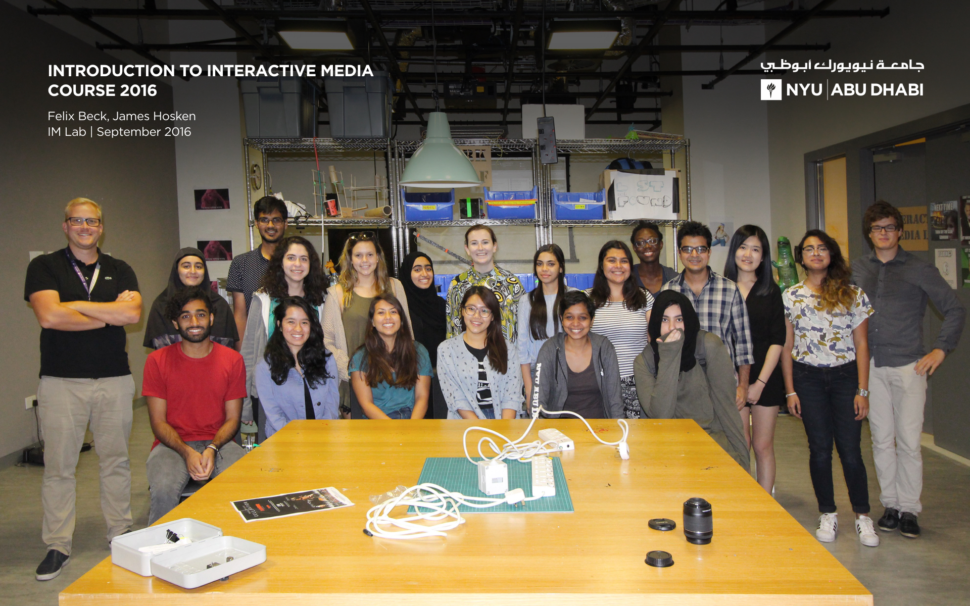The course Intro to IM course was taught in Fall 2014 by Scott Fitzgerald at NYUAD, 2015. The general structure and the course Syllabus were designed by him. A documentation of student works and code snippets from Fall 2015 can be found on the following website: http://intro.nyuad.im. Most texts on this wiki-side are copy-pasted from the original Syllabus. The Syllabus got slightly modified for the course that Felix taught in Fall 2016. — Felix Beck 2016/08/30 19:05