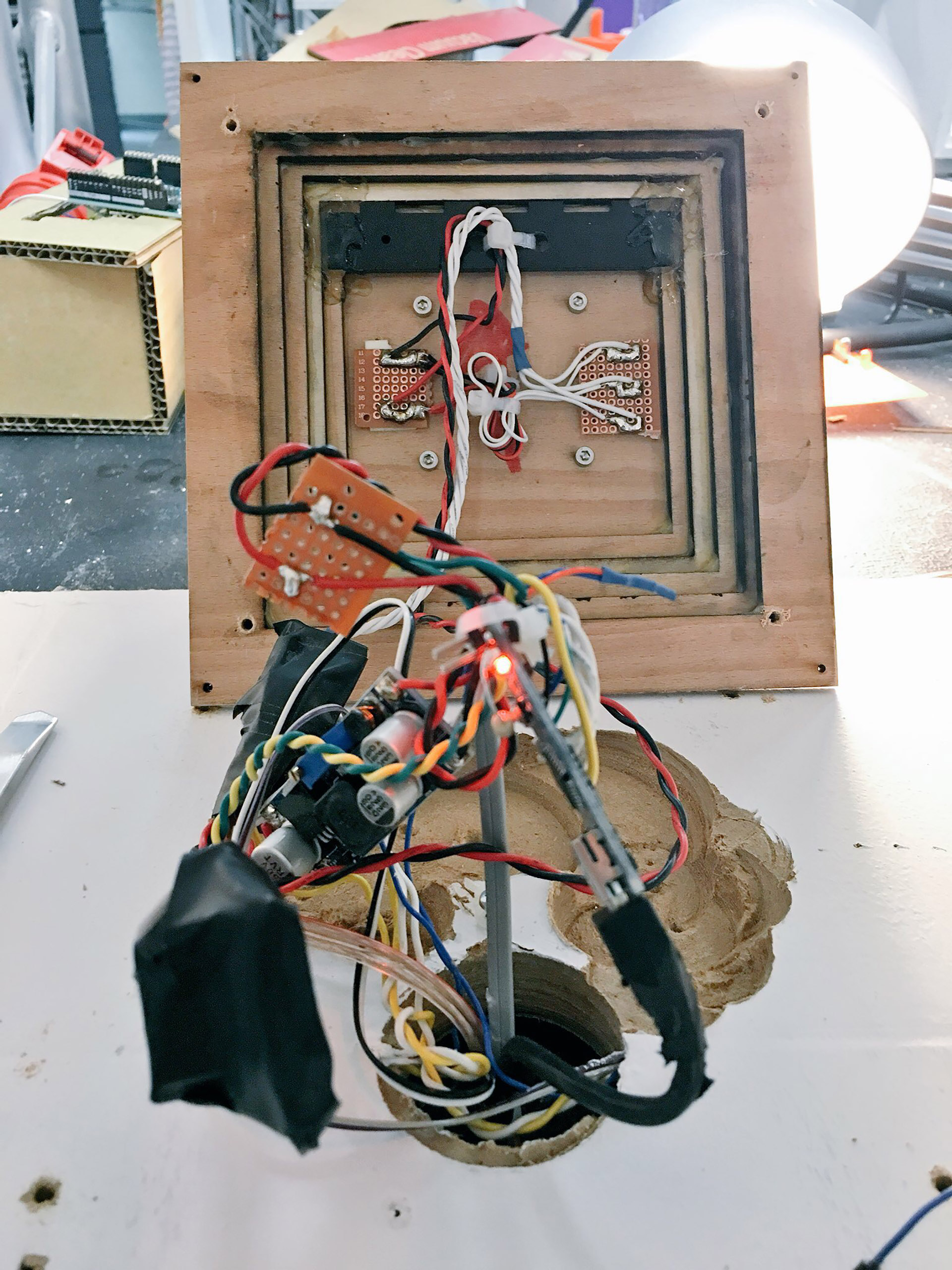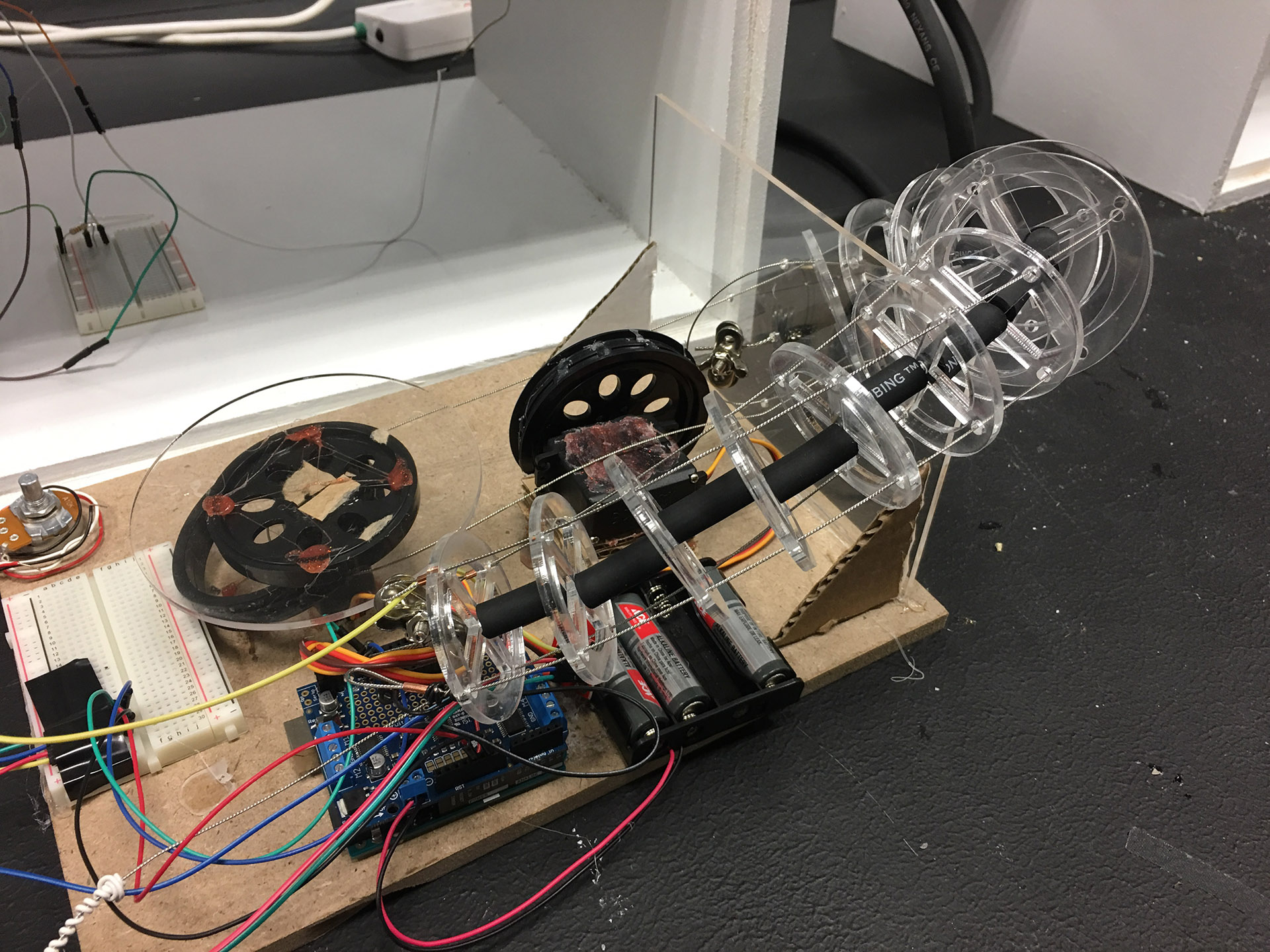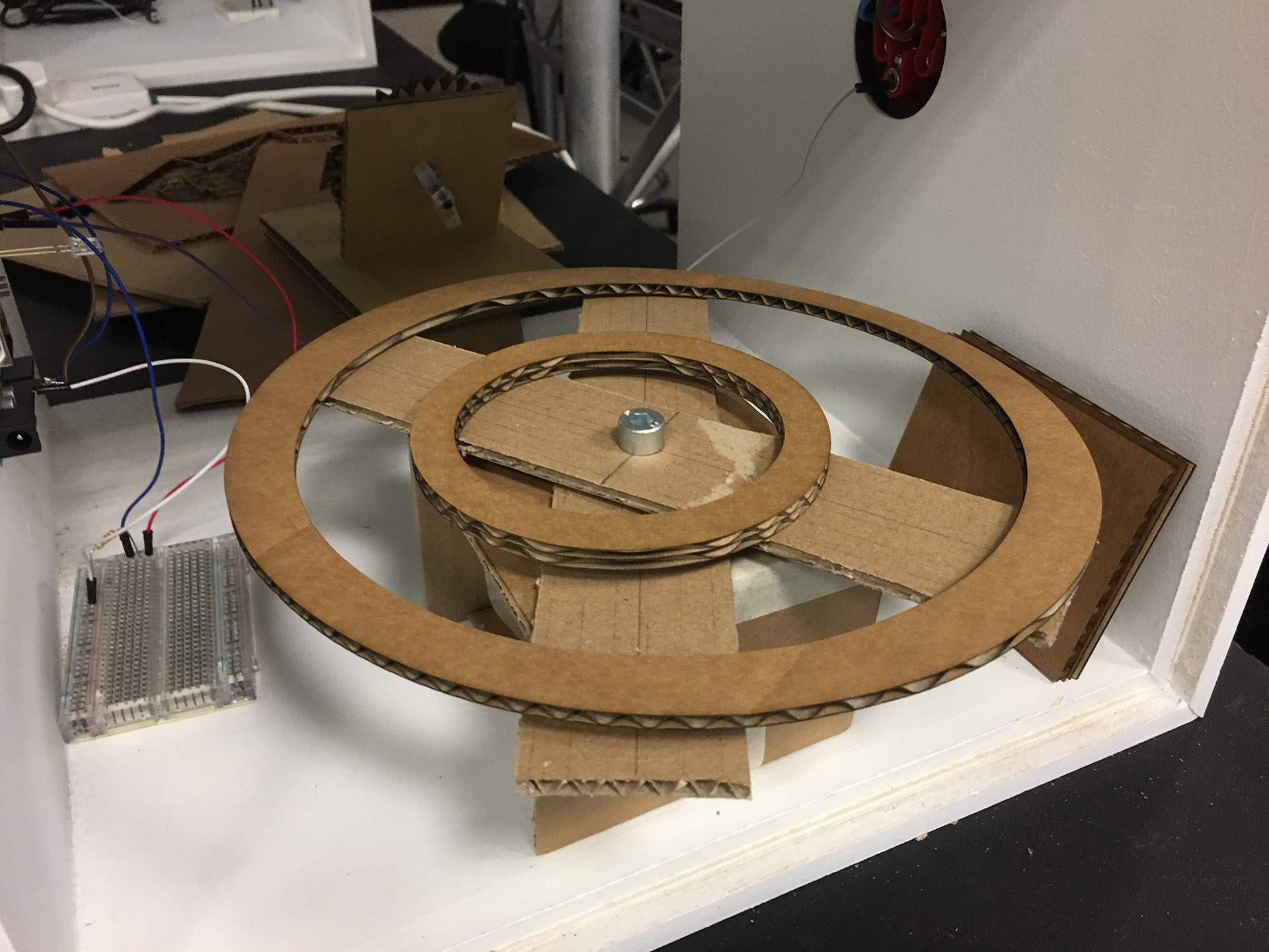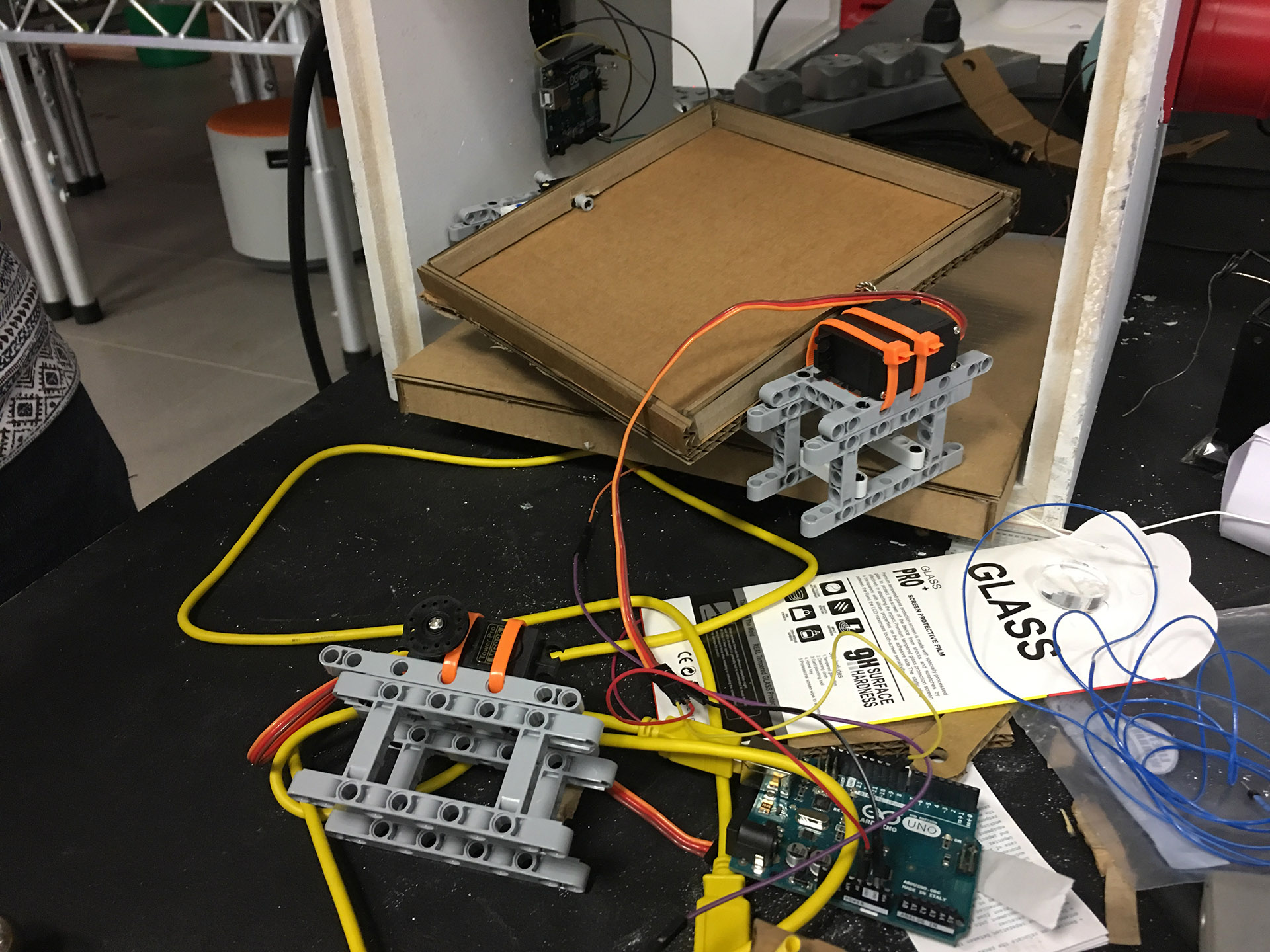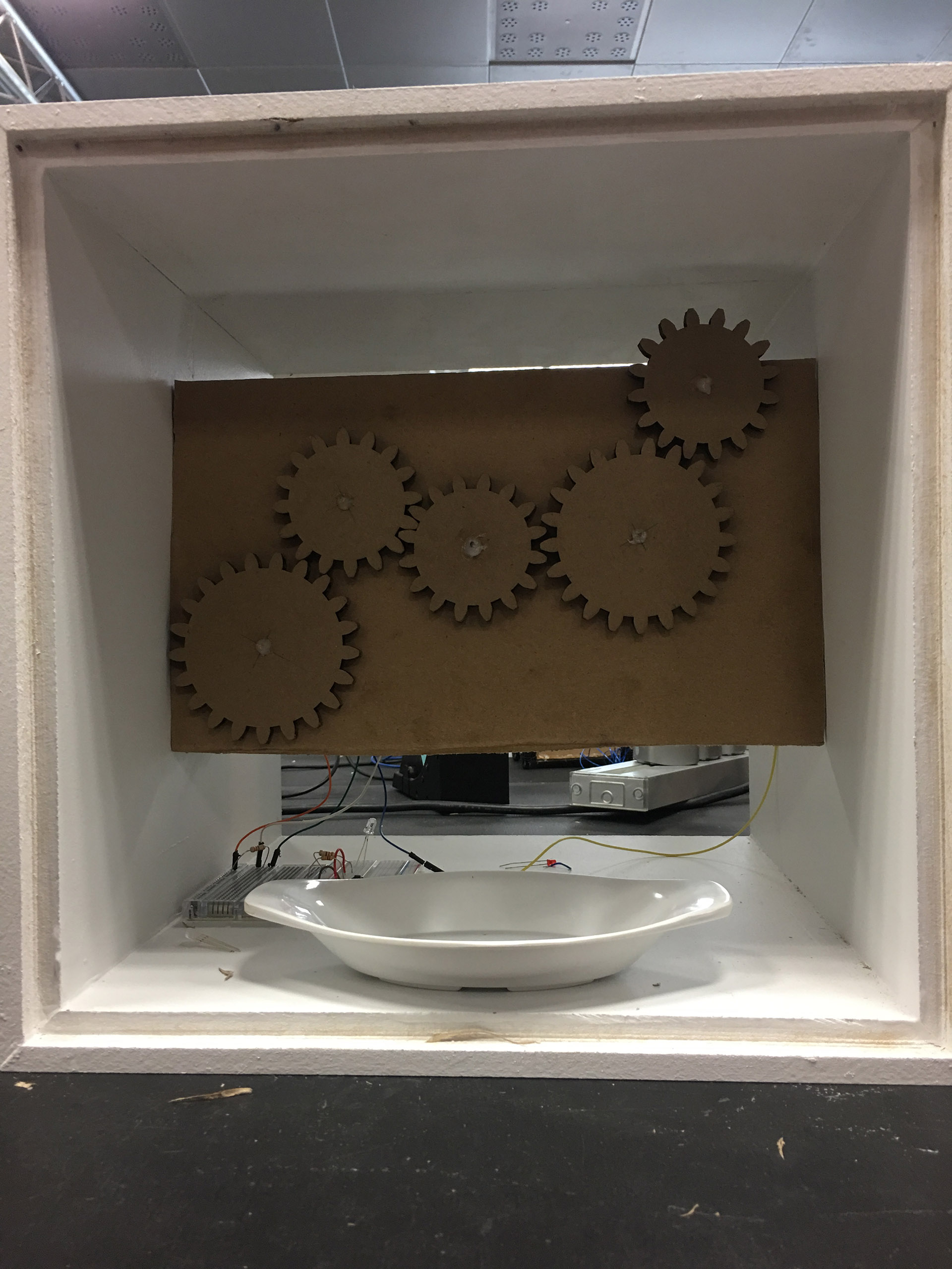 Task for 2017: Every participating student will have to create a machine that fits into a white box, that will be handed out to each student (see above). The boxes will be inter connected with a signal cable. A signal will be handed over from one machine to the next (from one students' work to the next). The moment a signals occurs in ones box the student has 30 seconds of time to start and run their individual machines. Find the different code versions for the Arduino Uno Boards that are used in the Boxes here. Example ideas: m_m2017_ideas.png