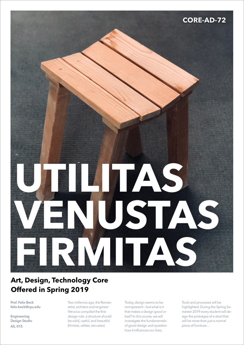 The course »Utilitas, Venustas, Firmitas 1 « (latin for usage, beauty, and stability) explores how design influences our life, and investigates the fundamentals of “good design“ – how to be innovative, while keeping the design useful, aesthetic, understandable, unobtrusive, honest, long-lasting, detailed and environmentally friendly, and at the same time focusing on essential aspects. Students take a global look at the status quo of the use of design in media, objects and architecture, and observe its influence to art and technology from past to present, dealing with questions concerning ethics and values. Design tools and processes will be highlighted. Based on the fusion of readings, study, discussion and experiences, over the course of the semester students will develop an understanding of how mutually reinforcing and beneficiary a mix of Art, Design and Technology can be. Lecture and discussion will be the breeding ground for concept development of the design of a Bricolage : Every student will realise a <font inherit/inherit;;inherit;;#FFFF00>stool design</font> – a stool that can do something very special, and that represents more than just its pure functionality. The asterisk in the semester theme title The * Stool represents one of the multiple solutions that students will develop during the semester. The project will be complemented by lectures and case-studies, reading assignments (completed prior to class), class discussions and one-on-one meetings with the instructor. There will be several non-obligatory topic related excursions (weekend trip, evening events, etc.).