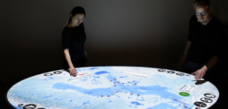 The Ozeanum was inaugurated in Stralsund in July 2008. It is the museum and aquarium of the underwater world of the northern seas built by the Deutsches Meeresmuseum (German Marine Museum). ART+COM has developed an interactive knowledge table about the Baltic Sea, which illustrates the influence of industry, tourism and agriculture in the sea. A documentation video can be found here.