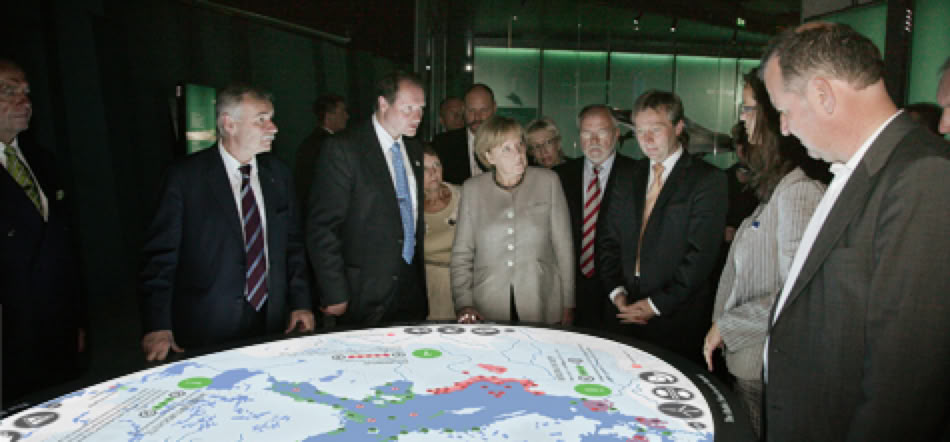 On the surface of the oval 2.2 by 1.6 meters long table, the entire Baltic Sea is shown with the adjacent coastal areas as an extensive animated information graphic. Ten symbols represent the various business sectors that affect the ecosystem of the Baltic Sea. Information windows open on touching the icons and visitors can control the activities of the industries such as fisheries or shipping traffic, and hence the degree of negative impact – marked in red – on the Baltic Sea. In another step, measures to limit damage, resolve conflicts of use and protect the sea – marked in green – can be tested interactively.