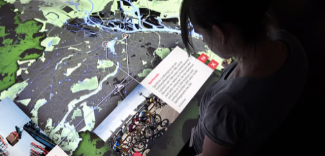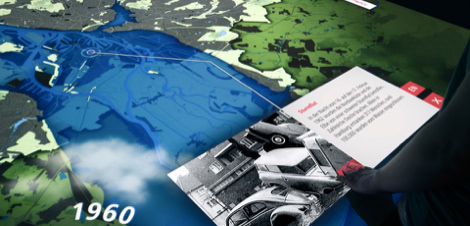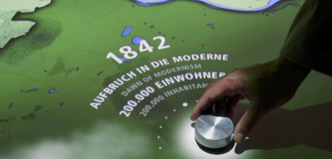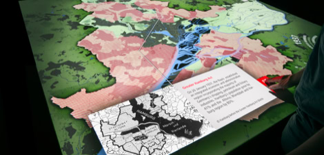 After extensive revision, the Hamburg museum opened a section entitled “The harbour – a key stimulus” featuring a large-scale interactive media table as its central element. The touch-sensitive installation allows visitors to undertake an interactive journey through time and space, exploring the development of the city from the Middle Ages through to the present day.