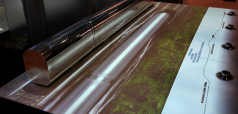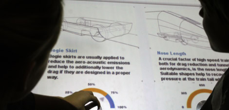 The “Aerodynamic” table enables the visitor to test how changes in train construction affect its speed and carbon footprint. By turning knobs, for instance, the front of the train that is projected onto the table can be shortened or elongated. After racing against Bombardier’s Zefiro train, which stands on the table as an aluminium model, an extensive comparative analysis of both trains appears.