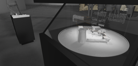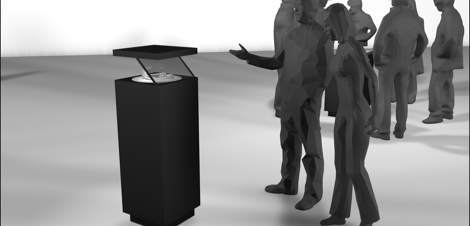 The installation Floating Cross Sections is based on the Pepper’s Ghost principle which uses a computer screen in combination with a semi-transparent mirror to visually overlay (augment) a physical artefact (architectural model) with virtual information (digital data-set of the architectural structure). The result is a narrative tool to educate audiences about the historical structure. The NTSI research team developed both a 3D model of the concept and a holographic structuring of historical information.