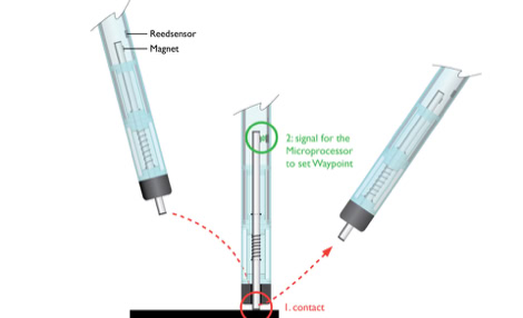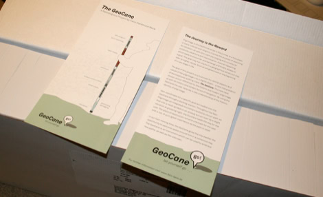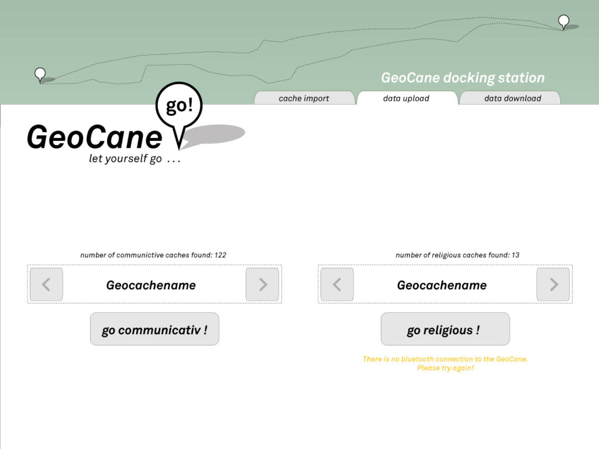 Geographical coordinates for a specific goal are loaded onto the GɇoCane through a docking-station. Throughout the Neo-Pilgrimage an integrated micro-controller running a software traces the chosen path, so that one is never guided on an already known road. By a slight vibration at grasping hight, the cane leads the way for the user. The place of destination remains unknown for the user and is not of such great importance as the path in itself.