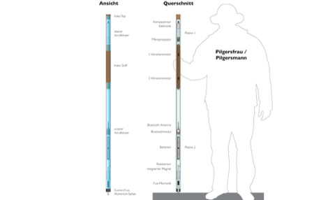 The goal of this project was to translate the central aspects and values of the pilgrimage into a digital object – a new interpretation of the traditional walking-cane: The GɇoCane. This new cane shows various references to the historic and modern pilgrimage, as well as historic and modern forms of navigation. By using the GɇoCane, the user receives a new understanding of the historic identity of pilgrimage.