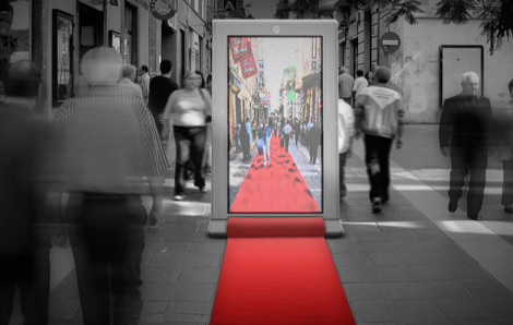 The Puerta Conectora is the concept for an installation in the public space. Two Terminals on the Canary Islands (one in Tenerife, the other in Gran Canary) are connected – everyone films the street in which it is positioned and sends it to the other Terminal which shows it on a display at the end of a red carpet. The Puerta Conectora functions for the people as a virtual-connection-door to the other island.