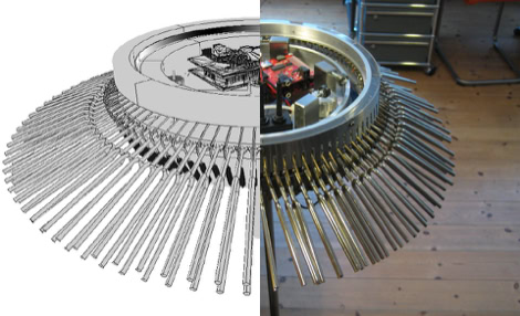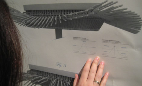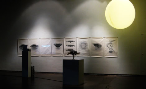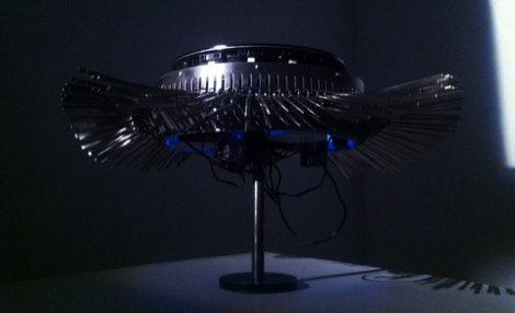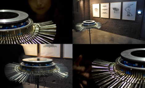 A main characteristic of the anatomy of Hexacorallia Zoantharia is a ring of bifurcated cilia which both senses and provides motile function. In the Zoanthroid, these functions of the cilia are elaborated analogically, deploying ninety tuning forks, which resemble the bifurcated structure of the Zoantharian cilia. The tuning forks are actuated mechanically in rhythmic undulating movements. They are also actuated acoustically by transducers in the body of the Zonathroid, which causes them to ring sympathetically. The sensing capability of the cilia is implemented technologically by deploying the cilia as theremin-like conductive antennae. This permits range-finding of human bodies within a short distance from the device. In exhibition, Zoanthroid is accompanied with a set of elegant technical drawings (see below) which emulate both engineering mechanical drawings, and biological anatomical studies.