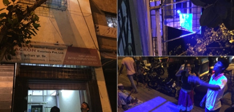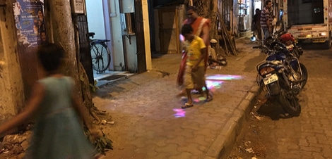 A temporary installation as homage to Holi – the indian Festival of Colours. A festival in which the participants chase and colour each other with colourful dry powder and coloured water. The frolic and fight with colours occurs in the streets and spreads over the whole city. Holi Hé is a reactive floor projection that refers to the trace of colours people leave behind during this event. The set-up took place in Dharavi (Mumbai, India).